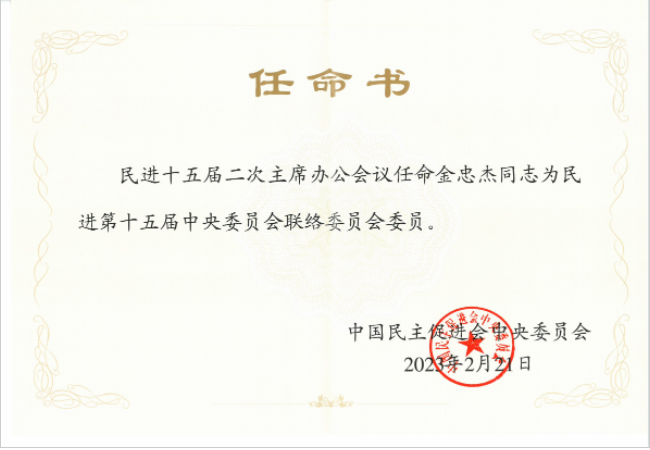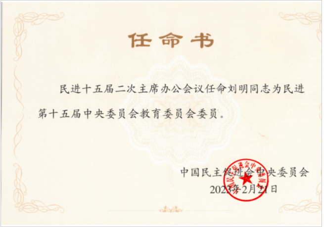 刘明教授被任命为民进第十五届中央委员会教育委员会委员,金忠杰教授被任命为民进第十五届中央委员会联络委员会委员,任期自2023年3月至2027年12月,并颁发了中国民主促进会中央委员会任命书。
