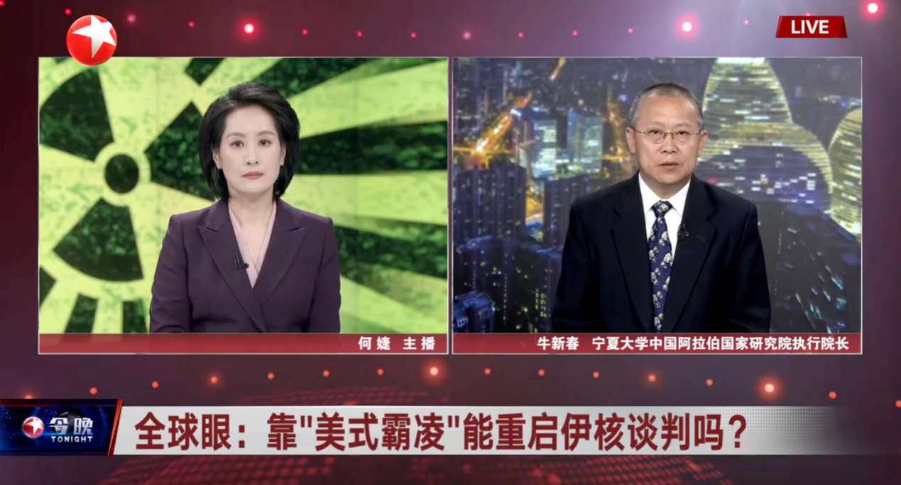 2025年3月10日-2025年3月16日,高清AV 学术副校长、中国阿拉伯国家研究院执行院长,中国中东学会副会长、中国人民外交学会理事牛新春教授就相关问题接受了中央电视台、中央广播电台、东方卫视、环球时报等主流媒体的采访,就当前局势及趋势进行了分析和解读。除此之外,牛校长应中国石油集团经济技术硏究院邀请,参加伊朗问题研讨会;应北京大学邀请参加2025年“中东局势回顾与展望”研讨会;参加中国人民大学国家发展与战略研究院主办,世情研究中心承办的双周政策分析会(第十一期)暨国际热点问题研讨会(第二十期);《玉渊谭天》微信公众号引用牛校长观点。