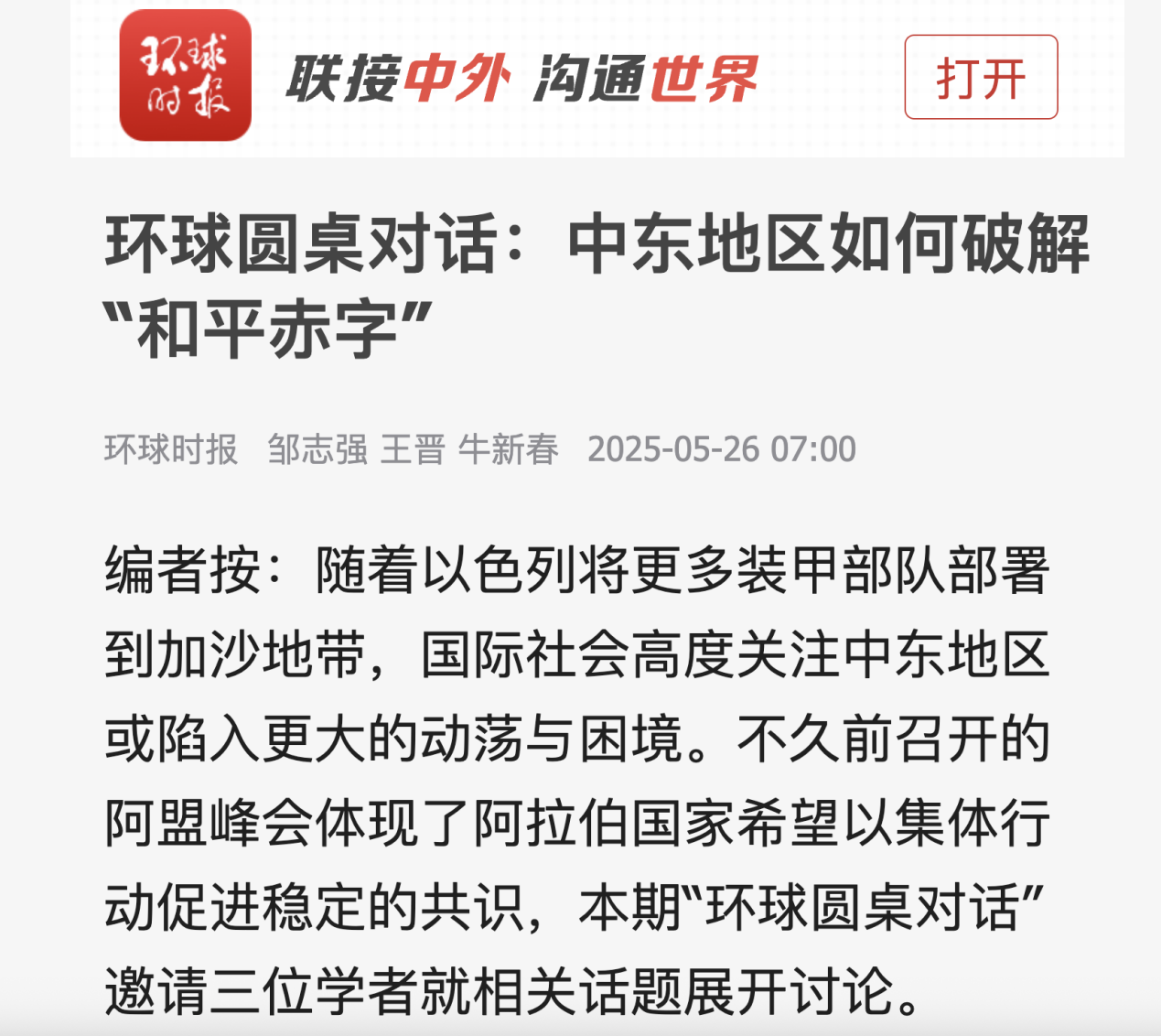 三十、5月26日接受环球网题为《环球圆桌对话:中东地区如何破解“和平赤字”》采访