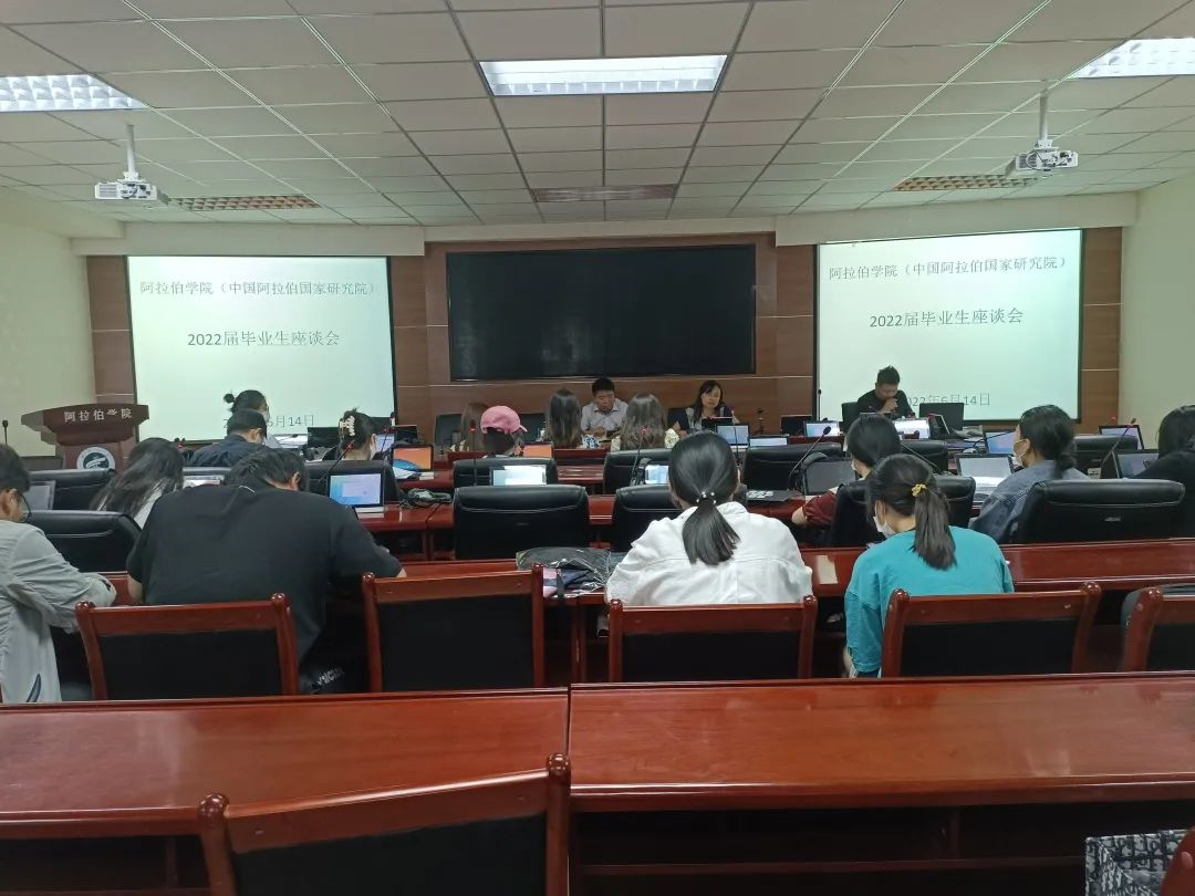 (中国阿拉伯国家研究院)在知行楼8楼会议室召开2022届毕业生座谈会。学院党总支书记李海燕、副书记赵永军、学生工作办公室主任金宁洋、2022届毕业生代表参加会议。会议由党总支副书记赵永军主持。