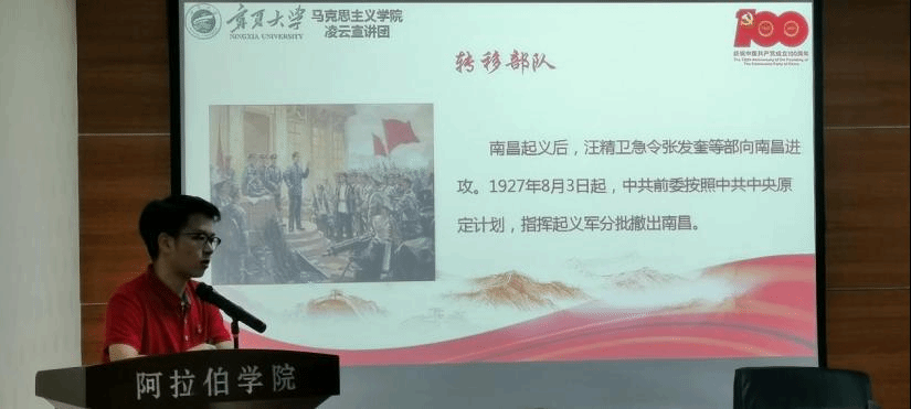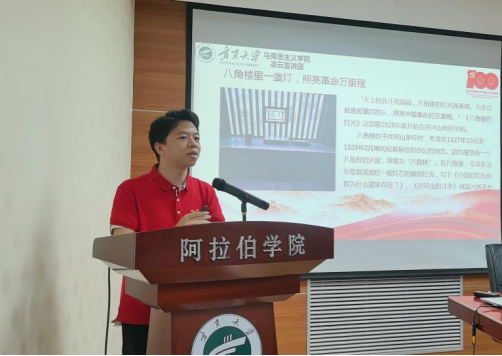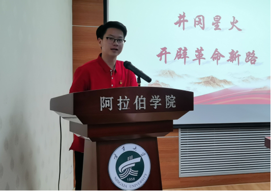 宣讲团第二组成员讲授的专题是“井冈星火,开辟革命道路”。首先,华悦同学以时间为线索为我们清晰梳理了党通过三大起义而创建革命军队的艰辛历程,重现了那段枪林弹雨的日子。他的宣讲慷慨激昂,内容丰富,使阿院学子受益匪浅。