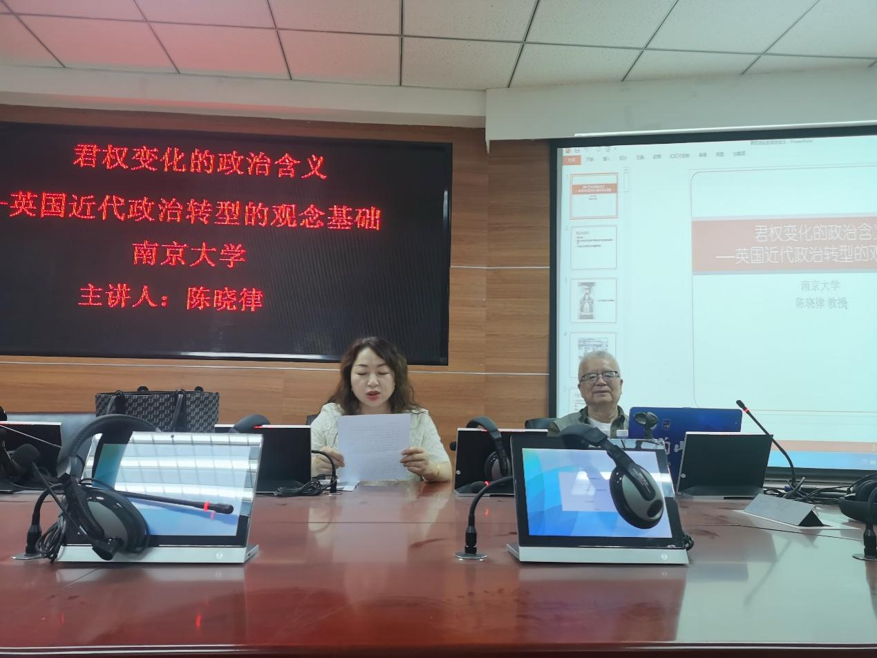 (中国阿拉伯国家研究院)党总支书记冯璐璐教授进行了总结发言,冯璐璐教授表示,陈教授本次讲座的意义在于弥补了我们在世界历史方面的欠缺。反观英国的君主制,中东国家也有许多君主制国家, 诸如海湾国家、约旦、摩洛哥等,陈教授的研究对理解中东的君主制有很大的启发意义和方法论的指导意义。她代表与会师生对陈晓律教授的精彩讲座表示感谢。