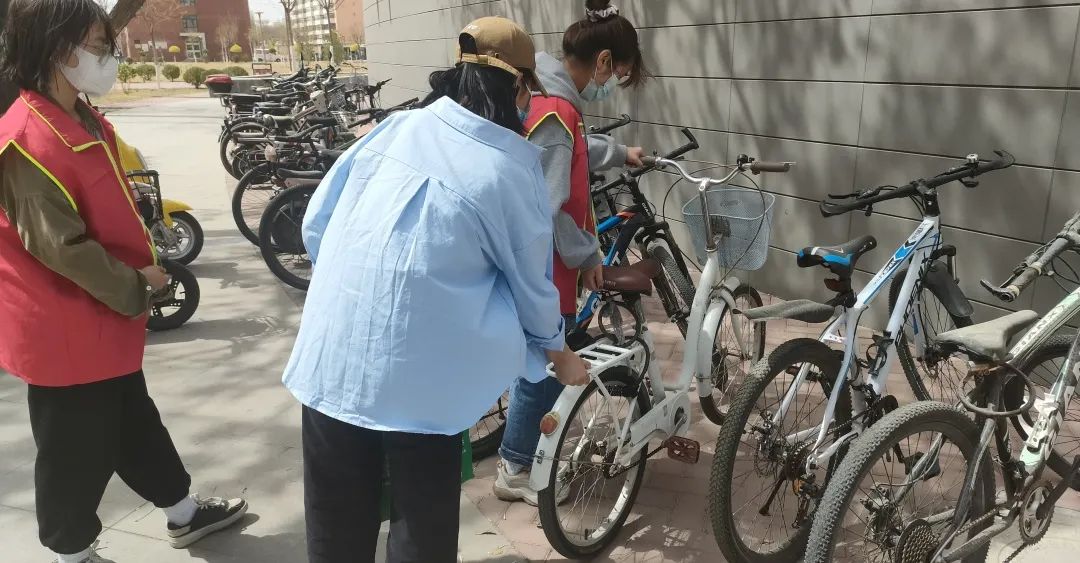 校园内停车位充足,但仍有不少同学贪图一时之便而随意停车。志愿者们重点整理了教学楼和宿舍楼前的自行车停放点车辆的摆放,恢复了校园整洁面貌。