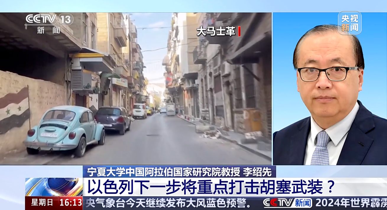 院长、中国中东学会顾问、教育部国别与区域研究专家委员会委员、中阿博览会顾问委员会主任委员李绍先接受了CCTV13《新闻直播间》栏目的采访,就当前局势进行了分析和解读。12月26-27日,李绍先院长出席义乌市宁夏商会换届大会暨义乌市同心商会成立大会,并在叙利亚变局下地缘秩序重构与经贸态势分享讲座发表重要讲话。