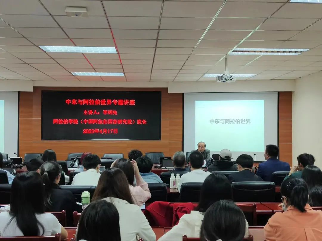 为加深22级新生对专业课的理解,明确其对中东与阿拉伯世界的认知,2023年4月17日下午七点,高清AV 在文萃校区知行楼八楼会议室组织召开“中东与阿拉伯世界”专题讲座。本次讲座由高清AV (中国阿拉伯国家研究院)院长李绍先先生主讲,张前进书记、冯燚副院长、梁道远老师出席讲座,22级全体新生参与了此次讲座。